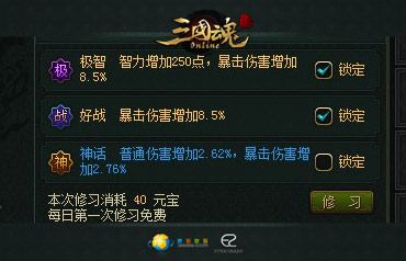 骑将行动敏捷,武力强大,追求稳定的普通伤害。所以推荐“神力”(既加普通伤害又加武力)、“鬼魅”(既加敏捷又加暴击率)和“神话”(既加暴击伤害又加普通伤害)。至于“灵巧”、“威武”和“稳定”仅可作为权宜之选。