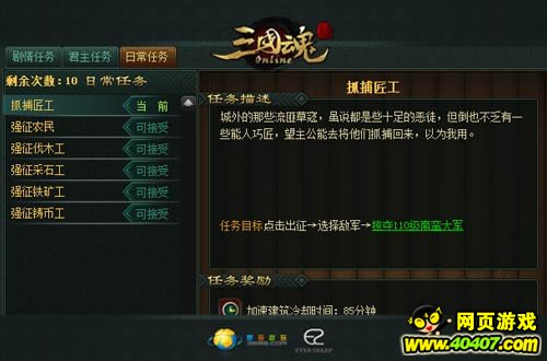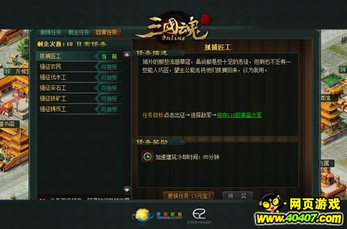 城池资源增长太慢?建筑升级冷却时间过长?不用担心,三国魂的日常任务系统让我们的城池从此可以轻松而又快速地发展了。