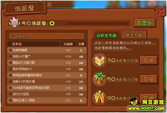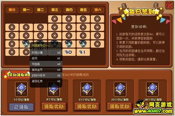 玩家活跃度达到40后就能进行每日签到了,根据玩家签到的次数可以获得签到礼包,签到礼包可是有着大量奖励包含在其中,当然也不乏金钱奖励。只要每天都进行签到,财源滚滚不是问题!