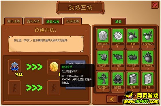 玩家收集了道具后能在改造工房进行道具兑换,只要收集一定数量的道具就能兑换到“银币”“金币”“高级金币”,从而获得大量的金钱。玩家在每次获得道具后不要急于卖出,兑换可能能获得更多的金钱收益哦!