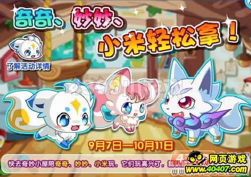 9月7日-10月11日,陪奇奇、妙妙、小米玩,让它们满意度达到100,就可以成为它们的主人咯!小奥拉都加油吧!!!