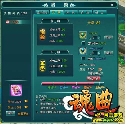 灵兽的天赋是一个非常重要的属性,可以说是一个灵兽的灵魂,除了决定宠物颜色品质外,还限制着成长和资质的上限。灵兽的初始天赋都不尽相同,但可以通过后天的提升,达到满值。天赋达到一定数值,还可增加灵兽不俗的攻击。