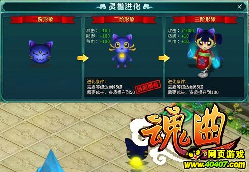 进化功能可以使宠物升阶,同时改变宠物外观,造型更拉风。只要将宠物提升到一定等级,宠物资质和成长到一定数值,即可自动进化,替换当前形象。进化的同时还能提升宠物数值,从而提升宠物战斗力。简而言之,进化可以使宠物更强大。