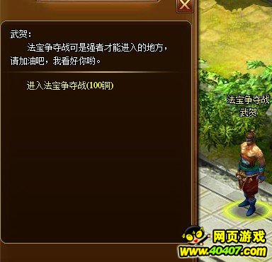 1.点击画面右上角『活动』→『副本』→法宝争夺战,点击“前往”即可自动寻路前往法宝争夺战NPC武贺处花费1两进入场地。