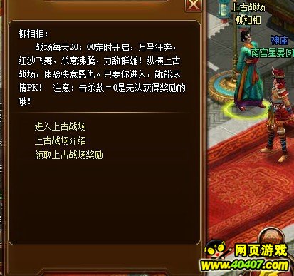 3.活动开启时,打开画面右上角『活动』→『上古战场』,点击“前往”可自动寻路到远古战场npc柳相相处,与之对话即可进入。