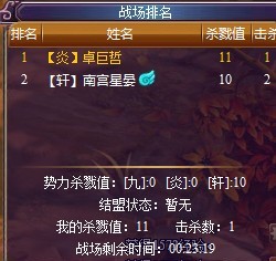 战场开始10分钟以后开始判断,当任意二个势力的总积分之和低于第三个势力的时候,这二个势力将自动处于结盟状态,互相不能攻击,只能攻击第三势力。结盟时间维持10分钟,10分钟后自动解散,解散之后系统将再次随时判断积分比较,看是否有二个势力满足结盟条件。