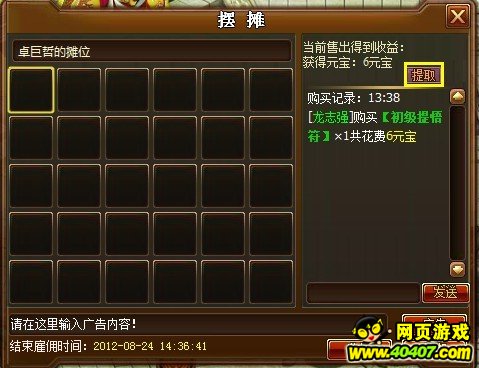 买家进行购买操作后,卖家的摊位上会显示信息,此时可以选择提取,或者在收摊后系统会进行金额结算,扣除3%的手续费,所余则会发送到卖家背包中。