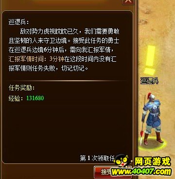 守卫边境任务每日可领取4次,任务失败也会计入任务次数,任务经验奖励会随完成该任务的次数而翻倍。