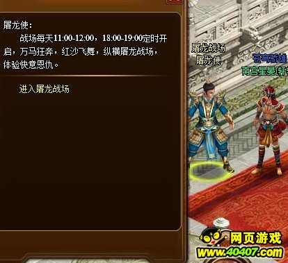 在王城的雕像旁边找到屠龙使,在特定的时间点击即可进入屠龙战场。