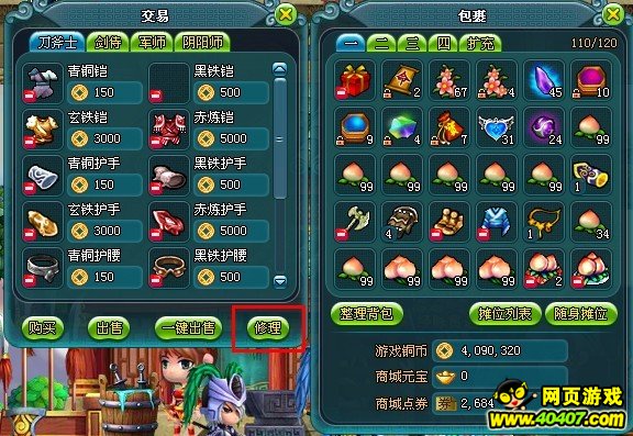 在4399《混世三国》中当武器和防具的耐久度降低时(最低可降至0),就需要进行修理。在各种装备店以及药店等皆可进行兵器装备的修理。每提升一点耐久度需要消耗一些游戏铜币。