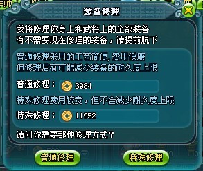 一、 普通修理价格便宜,但可能减少装备耐久度上限。