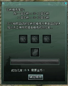第二 准备好足够的金币,玄铁的合成根据等级需要金币,每个号最好准备100W左右。看实际需求。一块6品铁合成后可以卖到600W金币。就足够这几个号合一阵的了。