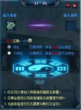 人物装备可以在作坊中进行打孔,打孔并不能直接提升装备的属性,但是要想在装备上镶嵌宝石则需要装备有空余的镶嵌孔,所以,打孔是宝石镶嵌的前期准备工作。花费游戏内货币可以将装备打出5个镶嵌孔,而之后要想继续打孔则需要消耗一定数量的打孔宝石才可以。