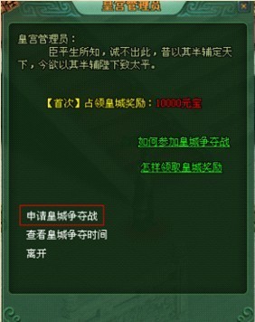 皇城争夺战是一个充满激情的活动,攻打沙城必须由公会会长到皇城的皇宫管理员申请攻城。和皇宫管理员对话,点击申请皇城争夺战就可以成功的申请攻城了。新区攻城战在开区第四天可以申请,晚上8点后不可以申请攻城战。
