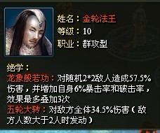 金轮法王:龙象般若功 随机2*2 57.5%伤害,并增加自己6%暴击、破击概率,可叠加3次。每提升一级伤害增加1.3%。