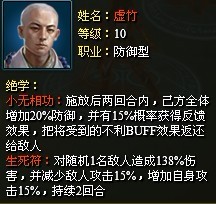 虚竹: 小无相 己方全体增加20%防御,15%把己方不益BUFF反馈给敌方。每提升一级反馈概率增加1%。
