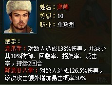 萧峰: 降龙十八掌 单攻126.5%伤害,附带暴击概率50百分。每提升一级伤害增加4.2%。
