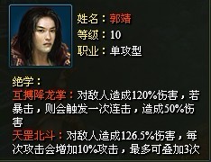 郭靖: 天罡北斗 单攻126.5%伤害,每次攻击增加10百分伤害,可叠加3次。每提升一级增加3.8%伤害。