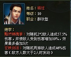 杨过: 黯然**掌 随机2*2 57.5%伤害,使目标伤害加深10%,可叠加3次。每提升一级伤害增加1.3%。