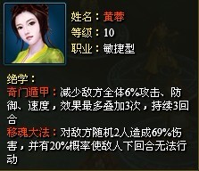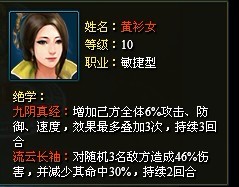 黄衫女: 九阴真经 己方攻击、防御、速度增加6百分,可叠加3次,持续3回合。