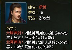 段誉: 六脉神剑 随机2列46%伤害,每提升一级增加1.1%伤害。