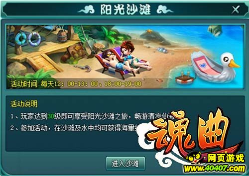 每天12:00-13:00、18:00-19:00,开放阳光沙滩活动,凡是等级达到30级及30级以上的玩家可通过界面入口参加活动。当然到了活动时间,系统会自动提醒进入。