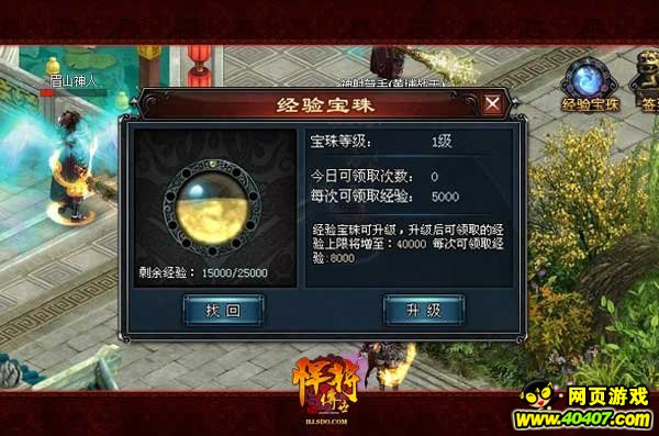 在进行相关的游戏更新之后,但凡15级以上的玩家登陆游戏后可以发现在右上方多出了一个叫“经验宝珠”的入口,点击进入后我们可以看到一些简单的介绍,经验宝珠具有几个针对性的功能,分别是领取、升级、充能和找回,玩家每天可以像ATM取款一样从中提取经验值,并通过升级来提升你每天的取款额度,要注意的是经验宝珠的升级会受限于玩家的自身角色等级。