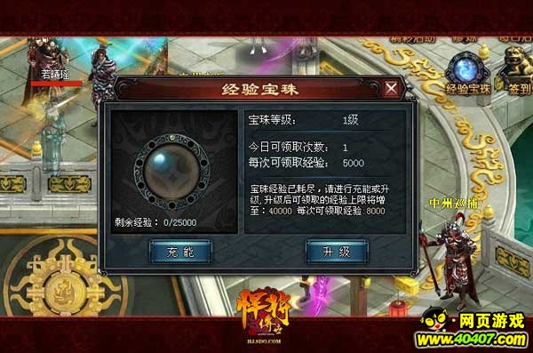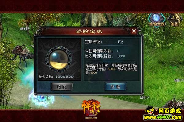 《悍将传世》本身非常推崇快速升级的概念,从最基本的打坐修炼、离线修炼,再到高级一点的副本扫荡、八卦门、魔将入侵等等,都是简单且快速有效的升级办法,而新增的这个经验宝珠更是将经验获取简化到了极致,完全的一键领取,不需要插卡也不需要输入密码,尽显悍将风格。