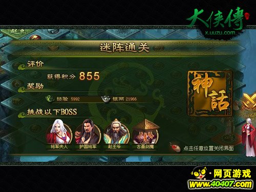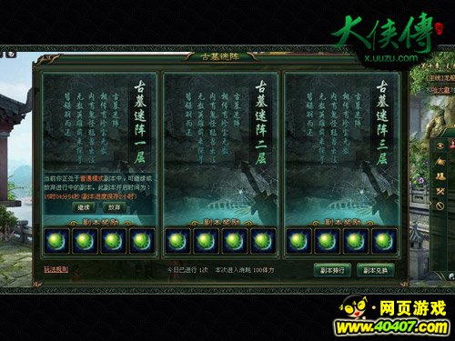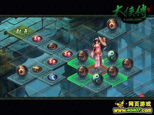 《大侠传》古墓迷阵是由85个格子组成的一个副本,这些格子就如同大富翁的棋格一样,只要移动到了上面就会触发相应的事件,并根据事件的类型与难度,奖励给玩家一定的积分。当玩家走到终点后,这些积分将作为最后副本评分的直接依据,副本评分越高奖励就越好,珍贵物品的掉落几率也会更高。