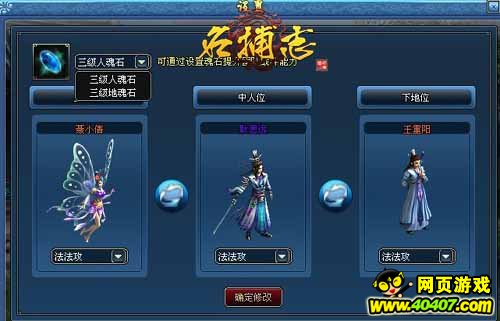 战斗阵法设置分三部分,站位,出手策略以及魂石。站位不必多说,在前在后随便玩家安排,天、地、人三大方位,根据对方的站位设定对应的职业定可有备无患。