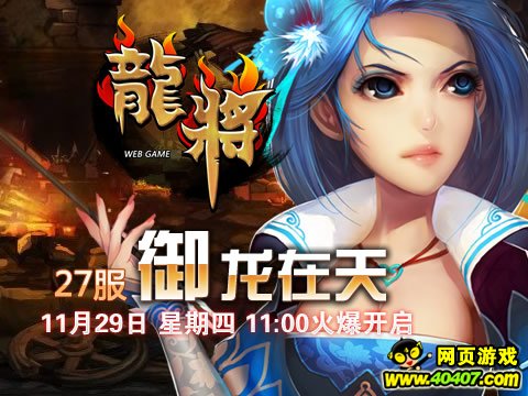 狗扑《龙将》双线27服将于2012年11月29日11:00震撼开启。精彩即将上演,超乎想象的游戏体验正期待您的加入! 喜迎新服开启,狗扑《龙将》已为您准备了丰富的开服活动助你在三国乱世中驰骋沙场、建功立业!