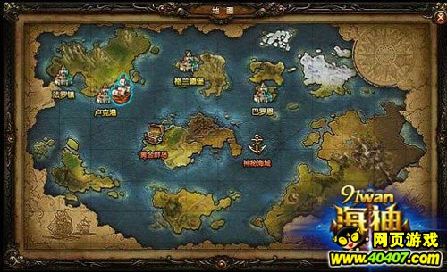 此神秘海图便是91wan《海神》人手一份的世界地图,目前包括法罗镇、巴罗恩、格兰德堡三座城市和黄金群岛、神秘海域共三大部分。法罗镇是罗兰帝国后裔世代居住的沿海小镇,也是航海家们开始冒险的地方,这里代表着坚毅和不屈,也代表了新生和希望,初来乍到的冒险少年们,要这这里逐步学习航海的基本知识。