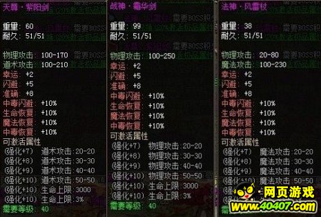 766z《龙城》游戏里积分武器分为40级积分武器、50级积分武器和60级积分武器。其中40级积分武器为:道士的天尊_紫阳剑、战士的战神_霜华剑和法师的法神_风雷杖。40级的神器在游戏中可以用100积分兑换得到,但是40级到50级很快就可以升级过去了,所以一般建议玩家可以先不集齐,先把积分留着到50级一起兑换。