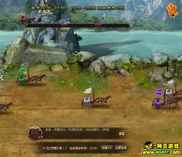 每天玩家都可以运镖三次但是也可以去劫别人的镖五次,如果你遇见个菜鸟镖师劫镖成功,那收益也会让你非常兴奋的。要是你还觉得不够给力,那么在PPTV《江湖奇缘》每天的16点——17点以及19点——20点,此期间完成押镖则可以多获得10%的铜币和声望收益,如果同时在这个时间敬拜济公则可以给全服玩家再带来10%的加成,可持续1小时 。这下够爽了吧?