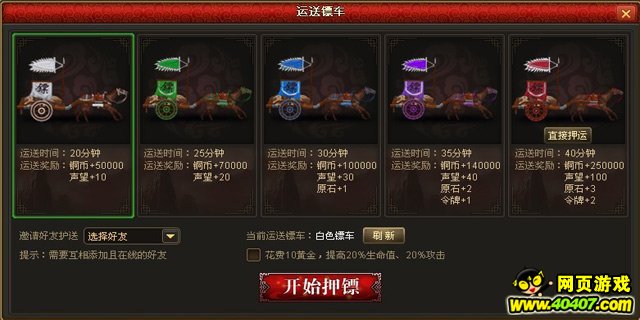 那么既然押镖是个危险活,那为什么玩家还要去做呢?那当然是风险与收益并存了,就如古代押镖也是为了博一把富贵,在游戏中押镖更是有大大的奖赏了。在《江湖奇缘》中玩家可以通过押镖可以获得铜币,声望,原石,令牌等奖励,而且根据押送镖车颜色的不同奖励的种类和数额也是不同噢。