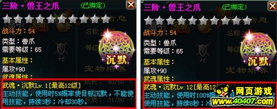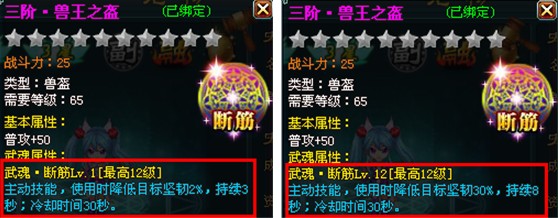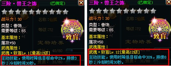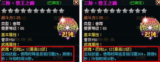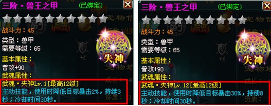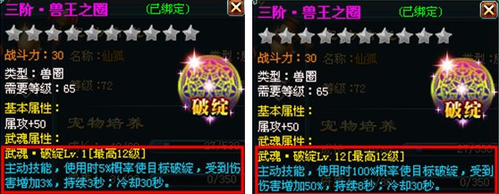 关键字:神魔仙界宠物 神魔仙界宠物装备 神魔仙界宠物装备武魂 宠物陪伴主人战斗一生,主人的装备武魂技能这么给力,怎能少得了宠物的装备武魂技能呢?宠物武魂技能可对敌人造成各种负面效果,是辅助主人战斗的利器! 激活条件:宠物装备升级到65级时自动激活武魂效果。 技能简介:武魂技能为主动技能,可通过【宠物装备打造】-【附魂】界面,对宠物装备武魂进行提升。各宠物装备部件的武魂效果如下: 1、兽盔武魂——断筋,可降低敌方坚韧 ![]() 2、兽甲武魂——失神,可降低敌方暴击 ![]() 3、兽爪武魂——沉默,有概率使敌方进入沉默状态 ![]() 4、兽饰武魂——致盲,可降低敌方命中 ![]() 5、兽圈武魂——破绽,有概率使敌方进入破绽状态 ![]() 6、兽蹄武魂——迟钝,可降低敌方闪避 ![]() 更多精彩尽在40407神魔仙界专区 http://www.40407.com/smxj/