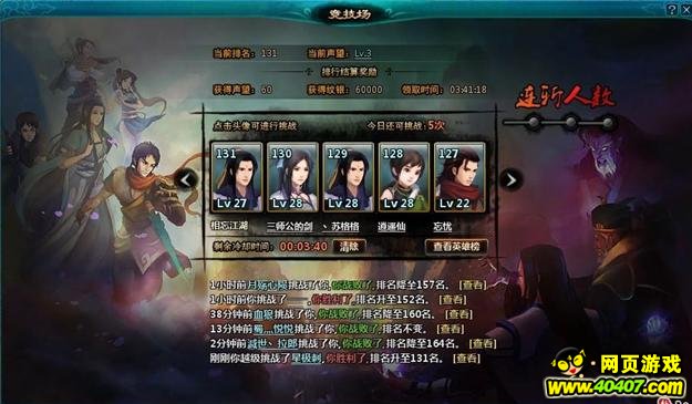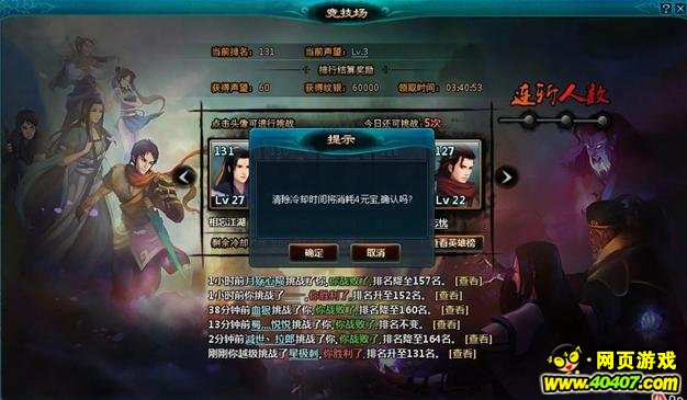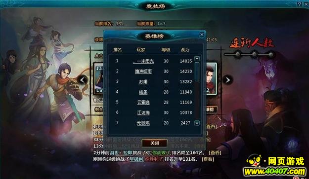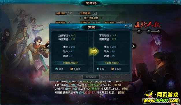![]() 竞技场声望升级系统 每次挑战完一位人物后可以用元宝消除冷却时间 ![]() 新仙剑竞技场初步解说就到这了。。。 更多精彩内容尽在40407新仙剑专区:http://www.40407.com/xinxj/