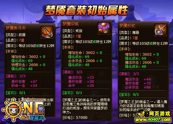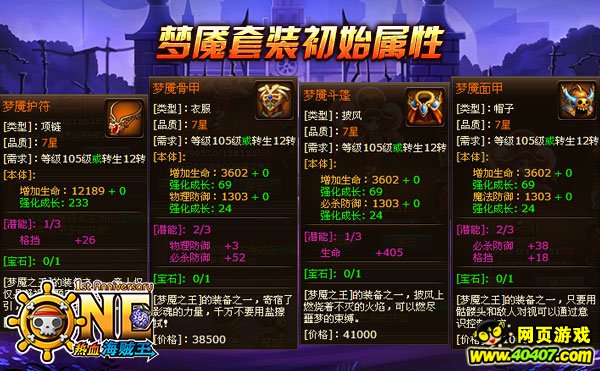 热血海贼王“恶魔果实”全新版本火爆开启,全民变身恶魔果实能力者,开启海贼超级大战!新版本还为海贼们开放了全新顶级装备,105级梦魇系列橙色套装全面上线,打造最强王者,成就海贼最强战力!热血海贼王新版本,诸多精彩内容,邀请海贼迷们一起体验! 新版本开启 精彩新内容全亮相 热血海贼王恶魔果实新版本全面开启,为各位海贼迷们带来各种精彩的游戏玩法和游戏内容。恶魔果实系统以及同步开启的恶魔果实树活动让所有海贼迷们可以获取并装备各种恶魔果实,体验动漫中不曾具有的果实能力;时装分解、强化系统让大家可以在享受炫酷时装的同时,也能获得更强的时装属性加成;105级顶级橙色套装,强悍属性更是让海贼迷们口水横流。诸多精彩玩法,期待大家的体验! ![]() ![]() 梦魇系列套装 打造最强战力 想要快速提升战斗力,装备很关键。继90级“夜空”套装、95级的“星灵”套装以及100级“天启”套装之后,《热血海贼王》再度开放新套装,105级的全新橙色顶级“梦魇”套装闪亮登场。“梦魇”系列需要将“天启”套装升级来获得,需要消耗贝里、紫色影魂以及All Blue中可以获取到的不同橙装材料来打造。新套装的成长属性更加强悍,海贼们可以通过装备传承和潜能转移将原有装备的强化等级和潜能都转移到全新的梦魇套装上去,非常方便。 ![]() ![]() ![]() 宝物洗炼 提升伙伴潜能属性 除了换上全新的“梦魇”套装提升战斗力外,海贼迷们还可以通过其他途径来提高战斗力,比如宝物系统等。在宝物系统中,海贼们可以通过强化以及洗炼来增加宝物的属性。其中,宝物的封印属性从第五层开始,就有一定的几率洗出潜能属性。不同性质的装备能洗出的潜能各不相同,火、雷、暗属性的宝物就可以洗出攻击相关的潜能。宝物洗出的潜能属性可以直接加给伙伴,达到一定数值,就能够直接改变伙伴的潜能评级,战力大提升,直接变身高富帅! ![]() ![]() 热血海贼王“恶魔果实”新版本火爆开启,打造海贼最强战力,加入伟大航道上最激烈的战斗!海贼王,我当定了! 更多精彩推荐: 更多精彩尽在40407热血海贼王专区http://www.40407.com/rxhzw/ |