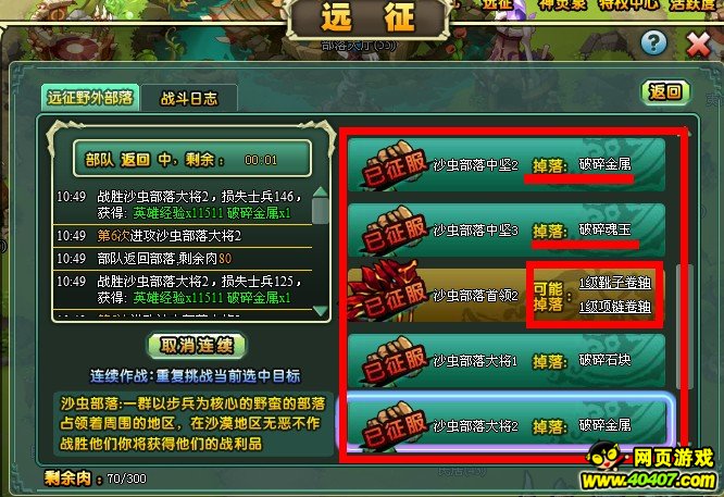 关键字:部落守卫战装备磨洗 部落守卫战装备磨洗材料 部落守卫战装备磨洗等级 各位部落战友们,装备的磨洗是一个很重要的功能,它会大幅度的提升我们英雄的战斗力,那么装备怎么磨洗,需要什么材料,什么时候可以磨洗呢?下面小编会详细和大家说说装备磨洗的步骤攻略! 当我们的酋长等级达到12级的时候,装备磨洗功能就会开启,同时获取装备磨洗材料的新功能远征也会开启。首先我们必须先去远征获取材料接下来才能进行装备磨洗! 部落远征: ![]() 当达到12级的时候,远征按钮开启,点击进入即可进行远征获取材料,随之而来的还有大量的英雄经验,所以这个远征每天无论如何都不能错过。 ![]() 由上图可看出,各种磨洗图纸和材料都可以从远征获取。应当注意的是,首领掉落图纸,小怪掉落材料,相对的首领会相当的强力,开打的时候应当看准首领的布阵然后相应的实用克制首领的阵型会比较简单。另外,远征是会损失兵力的,建议大家远征是实用克制的阵法去对付。 当我们从远征中获取到足够的材料之后,加下来我们就可以合成装备磨洗需要的磨石进行磨洗装备了! 获取到材料后,可以在包裹中找到,点击图纸进行合成磨石。 ![]() 磨石合成之后,打开英雄界面可以看到装备磨洗的蓝色箭头,点击进入磨洗界面。
