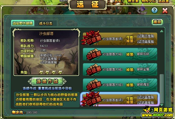 关键字:部落守卫战远征 部落守卫战远征几级开 部落守卫战远征奖励 部落守卫战远征功能是当玩家达到12级的时候开启的一个新功能系统,在这里我们的英雄可以对NPC部落进行征战获取磨石图纸和材料,这些图纸材料做出来的东西是给装备磨练的,可以加强装备的属性,提高战斗力。 相关情况可以看:部落守卫战装备磨洗步骤攻略 那么远征是什么情况的,下面随小编一起详细的看看步骤攻略吧: 远征按钮:当玩家达到12级,就会出现远征按钮,点击进入远征界面 ![]() 远征内容:不同等级会有不同的部落可以征战,例如12级是沙虫部落,13级是暴龙部落等。获取的图纸材料也会不同。 ![]() 选择要征战的部落,点击进入 ![]() ![]() 征战界面,选择需要征战的目标,首领掉图纸,小兵掉材料,可以选择性的去攻打。 ![]() 只要通关一次之后,就可以连续自动作战了,不用一次一次的去手动打,这一点相当的便捷。 ![]() 当然了,不会让你无限的征战,征战是会消耗肉的,一次消耗10个,而肉是每小时回复10点。 以上就是征战的详细攻略步骤,希望给大家带来帮助。请继续关注40407部落守卫战专区。 更多精彩内容: 游戏交流尽在40407 部落守卫战专区论坛 更多精彩内容尽在40407部落守卫战专区http://www.40407.com/blswz/ |