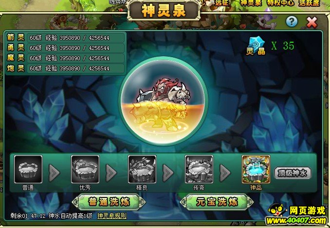 关键字:部落守卫战神灵泉 部落守卫战神灵泉规则 部落守卫战神灵泉怎么用 部落守卫战中,当玩家达到11级的时候,就会开放神灵泉系统,这个系统是增加英雄经验的,可以进一步加快英雄的升级速度。现在一起来看看怎么实用神灵泉系统吧! 神灵泉按钮: ![]() 神灵泉内容:每天有35个灵晶,也就是每天可以使用35次,每次要消耗1W金币;灵泉分五个级别,不同的级别给的经验倍数不尽相同。 ![]() 神灵泉级别: ![]() ![]() ![]() 建议每天只点后三个级别的,前两个级别的性价比太低了。 神灵泉规则: 1. 神水分成“神品”、“传奇”、“精良”、“优秀”、“普通”五个等级,分别对应翻倍16倍、12倍、8倍、4倍、2倍五个倍率。 2. 每日首次进入灵泉界面时神水品质停留在“神品”品质,每次“普通洗炼”都有一定几率会掉低一个品质,“元宝洗炼”不会降低神水品质; 3. 玩家可以通过神水旁的“顶级神水”恢复神水品质。使用该操作后光标将会即刻回到“顶级神水”上。每次使用“顶级神水”都将消耗一定数量的元宝; 4. 神水品质每2小时自动恢复1个品质; 5. 每日首次“顶级神水”操作免费(即每日赠送1次免费顶级神水); 6. 当用户点击“普通洗炼”、“元宝洗炼”后,会根据当前光标所处神水等级对基础经验乘以对应该品质神水的倍率作为玩家洗炼经验奖励; “普通洗炼”规则: 1. 每次“普通洗炼”将会消耗一定数量的金币; 2. 每次“普通洗炼”都会有一定数量的基础经验,根据酋长等级该数值不同,酋长等级越高该值越大; 3. 每次“普通洗炼”操作时将根据当前光标所处的神水品质对基础经验翻倍,翻倍后的经验即为该次操作得到的经验值; 4. 每次“普通洗炼”结束后,神水都有一定几率掉下一级。 “元宝洗炼”规则: 1. 每次“元宝洗炼”将会消耗一定数量的元宝和金币; 2. 每次“元宝洗炼”都会有一定数量的基础经验(元宝洗炼经验远高于普通洗炼经验),根据酋长等级该数值不同,酋长等级越高该值越大; 3. 每次“元宝洗炼”操作时将根据当前光标所处的神水品质对基础经验翻倍,翻倍后的经验即为该次操作得到的经验值; 4.“元宝洗炼”不会导致神水品质降低。 以上就是神灵泉的详细攻略内容。请继续关注40407部落守卫战专区。 更多精彩内容: 游戏交流尽在40407 部落守卫战专区论坛 更多精彩内容尽在40407部落守卫战专区http://www.40407.com/blswz/ |