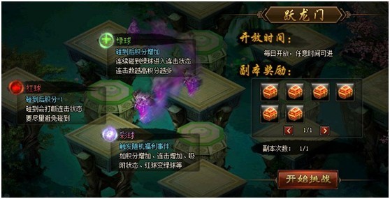 而跃龙门就是为轻功特别设定的一个副本,玩家可以在神城中找到龙门使者,开启跃龙门副本,副本中有些类似梅花桩的台子,玩家需要在台子上来回跳跃,台子上会随机出现绿色,红色和彩色的球,碰触绿色的球会增加连击,碰触红色的球就会中断连击,而且会减积分。而最好的就是彩球了,碰触彩球会触发随机事件,不过触发的都是有益事件,所以大胆放心的去碰吧。
