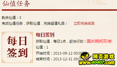 关键字:新仙剑仙值每日签到 新仙剑仙值国庆双倍 新仙剑仙值每日签到国庆双倍介绍 小编今天去签到,看到了仙值的每日签到在国庆期间是双倍哦,对仙值的礼包有兴趣的玩家别错过哦~ ![]() 仙值可以换的东西: 仙值普通礼包:纹银10w、灵力1w、中级金蚕王*5、中级体力丹*1 。仙剑豪华礼包 仙值豪华礼包:纹银50w、灵力5w、洗练宝石*20、飞剑进阶丹*20、高级体力丹*1。 仙值尊贵礼包:纹银100w、升星宝石*50、极品经验丹*5、极品金蚕王*5、极品体力丹*1 。 周边礼品盘点: U盘-李逍遥 U盘-韩菱纱 新仙剑T恤 iPhone4壳-王小虎 iPhone4壳-沈欺霜 iPhone5壳-王小虎 Phone5壳-沈欺霜 鼠标垫-重楼 鼠标垫-Q版 新仙剑抱枕 作业本-王小虎 作业本-唐雪见 新仙剑仙值每日签到国庆双倍介绍就到这了。 更多精彩推荐: