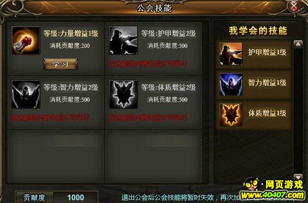 学习公会技能需要消耗贡献度,贡献度就是你捐钱多了,10W金子=100贡献。