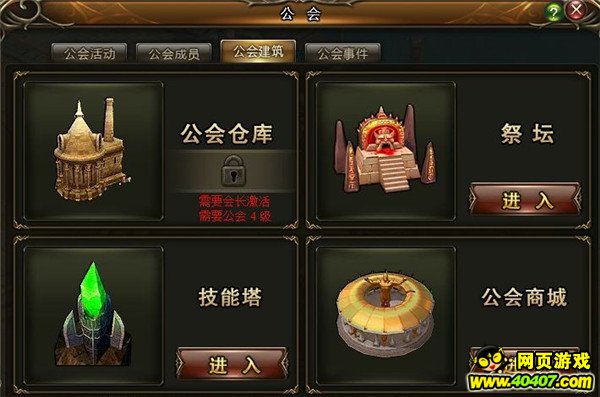 公会商店在公会面板的公会建筑页签,选择公会商城-进入。