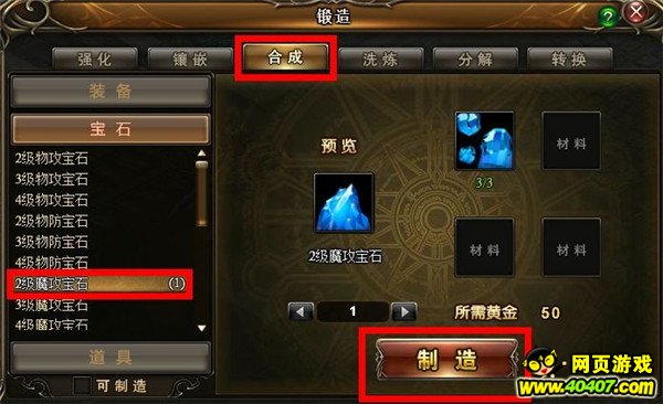 需要少量金币,选择需要合成的宝石,点击制造。