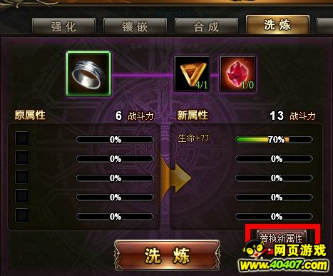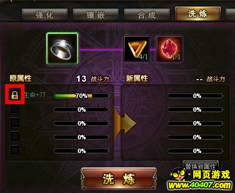 淬火石可以锁住属性,把洗炼后的新属性叠加上去,最高可洗炼到100%。商城有售。