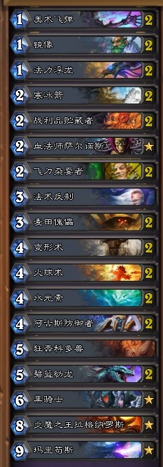概要:炉石传说法师,炉石传说法师牌组分享,法师怎么玩,法师攻略 目前法爷这个职业,自从炎爆削弱之后仿佛一蹶不振,其他职业我也会玩,不过本人对法师这个职业还是有特别的偏好,因为法爷有全职业最强的技能火冲,所以还是不是很想放弃,主要是因为其他职业牌不是很全。 这套蓝龙法师卡组在我上赛季的时候通过三天的持续奋战成功的天梯重置的倒数第二天冲上了传说,刚冲上去就重置,实在很不爽,关键啥奖励也没有,20到10级是用鱼人术士打的,今天看见有朋友问玛里苟斯怎么用,突然想写一篇介绍一下我这套牌。
