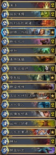 概要:炉石传说,炉石传说德鲁伊,炉石传说土豪德鲁伊牌组 我是一名土豪(请无视我的全金卡),我今天给你们带来一套可以冲进传说的德鲁伊卡组,主要是现在速攻圣骑跟渔人流的复兴。这个职业很容易让对面前期崩盘,我也尝试过加大嘲讽力度。不过一直都是被压着打。所以我还是尝试主动攻击的套牌。测试过后胜率一直保持的不错的,目前我也已经步入传说,这套牌保你进传说不成问题。当然别看全金卡,你全当普通卡就行了。这套卡一共就3橙,还算照顾屌丝。 组这套牌的初衷是现在天梯都是相同的卡组。发卡组的人肯定是习惯卡组的。抄来的都不熟悉- -。而且大部分都是比赛用的有针对性的套牌不适合天梯的环境。。 这套牌就是可以打一个出其不意。大量的BUFF优质的随从跟冲锋基本运气好都是5-7费带走。大猩猩这张牌我还在研究。主要前期打不到主动。就很卡手。 一般小鬼+野性不难压制场面。看起手的运气了。 牌组: