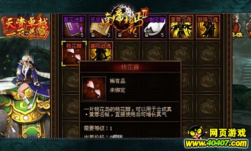 最后,51wan《南帝北丐2》特殊道具要数侠客招募范围内的了。想要招募真·侠客这种高级侠客,并不容易。但如果你获取了他们的一缕英魂的话,就可以用于合成侠客的名帖了,如此一来,不仅会增加成功招募真·侠客的几率,直接使用的话还可以增长真气,正可谓是一材两用。